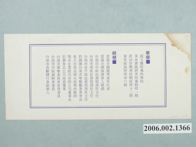 此為一選舉宣傳單,為陳瑞來第9屆臺南市市議員候選人的選舉宣傳單,此物件正面印有陳瑞來的照片,註明市議員候選人登記的號碼為3號,且印有其競選聯絡地址與電話。背面則印有陳瑞來的學歷、經歷以及現任職位。 此物件提到的陳瑞來,曾於革命實踐研究院黨幹班、政治作戰學校戰政班學習並且結業,後擔任第8屆的臺南市市議員,並且曾就任臺灣府城隍廟建醮委員會主任委員。此件的第9屆選舉中,陳瑞來也參加選舉但並未當選。 臺灣的縣市議員選舉始於日治時代,在1935年6月臺灣總督府發佈《市會議員及街庄協議會員選舉規程》後,在該年的11月22日舉行全臺第一次地方民意代表選舉,此次選舉,選出的民意代表官選、民選各半,而選出來之議員僅具議決權,不具有提案、質詢等權責。後在國民黨政府派員接收臺灣後,1945年臺灣行政長官公署公布「臺灣省各級民意機關成立方案」,並於1946年辦理間接選舉產生縣市參議員。而在1950年,舉辦了第1屆民選的縣市議員選舉,臺灣民眾得以選出為自身權益喉舌的議員。