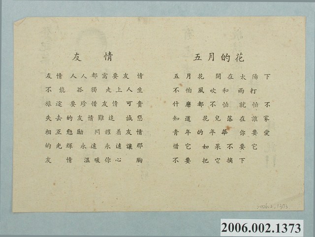 此為選舉傳單,是周婉珠為參與選舉所印製,傳單正面印有候選人相片及競選相關資訊,背面印有詩文二則。由傳單正面「初二信班全體鞠躬」推斷,此次選舉為校園中的學生幹部或學生代表選舉。