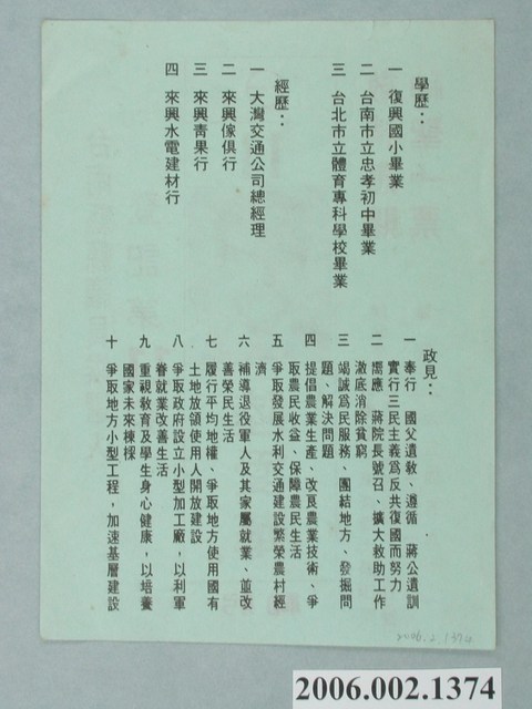 此為一選舉宣傳單,為陸愛華的臺南縣縣議員候選人的選舉宣傳單,此物件正面印有陸愛華的照片,並註明候選人登記的號碼為11號,且印有陸愛華的辦公室聯絡地址以及電話。背面則印有陸愛華的學歷、經歷以及此次選舉的相關政見。 此物件提到的陸愛華,曾擔任臺南縣議員,後擔任臺南縣永康市(現為臺南市永康區)的市民代表會主席,後於2002年參加台南縣永康市的事長選舉,但並未成功當選。 臺灣的縣市議員選舉始於日治時代,在1935年6月臺灣總督府發佈《市會議員及街庄協議會員選舉規程》後,在該年的11月22日舉行全臺第一次地方民意代表選舉,此次選舉,選出的民意代表官選、民選各半,而選出來之議員僅具議決權,不具有提案、質詢等權責。後在國民黨政府派員接收臺灣後,1945年臺灣行政長官公署公布「臺灣省各級民意機關成立方案」,並於1946年辦理間接選舉產生縣市參議員。而在1950年,舉辦了第1屆民選的縣市議員選舉,臺灣民眾得以選出為自身權益喉舌的議員。