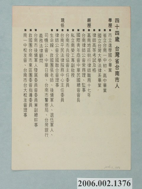 此物件為一選舉宣傳單,為1980年(民國69年)12月6日舉行的第一屆第三次增額立法委員選舉,發送宣傳單者為林聯輝,文宣中附有候選人的照片、選舉登記號等等資訊。 林聯輝曾代表中國國民黨在臺灣省第四選區(雲嘉南南)中,當選第一屆第三、四、五次的增額立法委員,亦曾擔任第二十一屆青年商會的總會長,並以律師身分號召法界人士在臺南成立平民法律扶助中心。 對於增額中央民意代表選舉的出現,始於種種因素。中華民國憲法於1946年制定、1947年公佈且實施,但國民黨政府在1947年制定「動員戡亂時期臨時條款」,凍結憲法部分條文,且中華民國政府在這段期間喪失了大陸地區的統治權,上述因素下,依據「大法官釋字第76號解釋文」,因而第一屆中央民意代表的任期得以無限延伸。1969年,政府開始推動首次的中央民意代表增補選,而後在1972年再次舉辦增補選,並開放局部改選以及定期改選。此後,在1975、1983、1986、1989年都設有增額立委選舉。由於選舉的名額在全體立委總額的比例有限,議會政治中相互制衡的效益較不顯著。然而選舉發揮了提升民眾政治意識的作用,也為「黨外」運動提供發揮的場域。