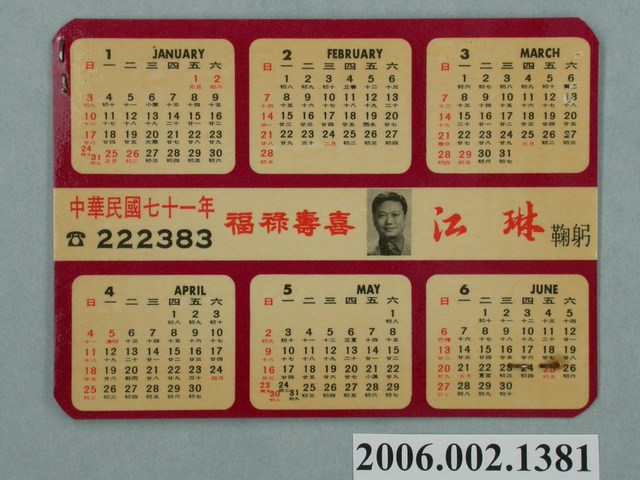 此物件為一選舉宣傳物,內容為一1982年的月曆,月曆印有臺南市議員選舉人江琳照片以及相關的宣傳文宣,另外也印有相關聯絡電話。 此物件提及的主要人物為江琳,畢業於成功大學中文系,並曾經進入革命實踐研究院學習,後擔任臺南市議會第9屆市議員,也擔任成大中文系系友會的首任會長。 臺灣的縣市議員選舉始於日治時代,在1935年6月臺灣總督府發佈《市會議員及街庄協議會員選舉規程》後,在該年的11月22日舉行全臺第一次地方民意代表選舉,此次選舉,選出的民意代表官選、民選各半,而選出來之議員僅具議決權,不具有提案、質詢等權責。後在國民黨政府派員接收臺灣後,1945年臺灣行政長官公署公布「臺灣省各級民意機關成立方案」,並於1946年辦理間接選舉產生縣市參議員。而在1950年,舉辦了第1屆民選的縣市議員選舉,臺灣民眾得以選出為自身權益喉舌的議員。