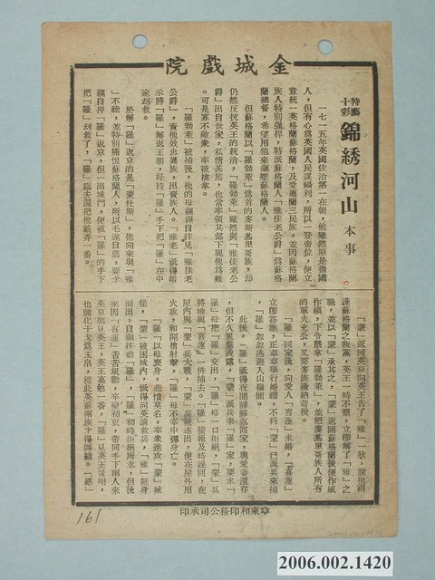 此物件是單張兩面,外觀保存良好,無破損情形,但因老舊物件上的圖片已經不清楚,由東和印務公司承印。 主要內容為金城戲院《錦綉河山》本事,講述的故事是關於英格蘭與蘇格蘭民族之間的故事,兩大民族願意化干戈為玉帛,英蘇兩民族才得以團結。 另一面是藝林影業公司發行之《王昭君》電影的宣傳單,此物件是香港電影藝林影業公司于1955年出品,是藝林影業公司耗資千萬金元歷史古裝巨片。該片由趙樹燊執導,利青雲、賀賓、馬笑儂、岳麟、童真、李丹露等領銜主演。講述了西漢元帝時和親宮女王昭君的故事。配有「昭君怨」等名歌數支。「三十年來國產電影從未有過如此豪華無雙瑰麗之作」,又稱「昭君和番」。 所謂「本事」為簡單印刷的電影故事介紹,由影院提供購票觀眾留作紀念。