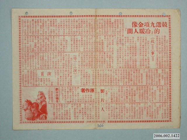 福斯公司發行之冷暖人間電影的宣傳單是單張兩面,外觀保存良好,無破損情形,但外表偏黃老舊掉色,不過字體尚且清楚。 物件名稱為:大舞台《冷暖人間》,是20世紀福斯公司千萬金元震驚影壇愛情文藝悲劇,本片在台北萬國戲院上映,25天創歷年來最高賣座紀錄!接連三月全美賣座冠軍。根據名作家嘉麗絲暢銷名著改編,由拉娜透納、賀蘭芝、狄娜華茜、泰莉摩亞等主演。 物件另一面是闡述《冷暖人間》的故事,包含導演介紹、演員、製作人、原作者,還有劇本改編者,原作者是嘉麗絲梅泰麗亞斯,是個作風大膽的女作家,曾經有人批評她對男女間的性問題,寫得太露骨,儘管如此,她的書仍然銷售到全美國每一個角落。劇本改編者是約翰米曹海斯,原著經過他三增兩減之後,成為了一部真善美兼俱的劇本。