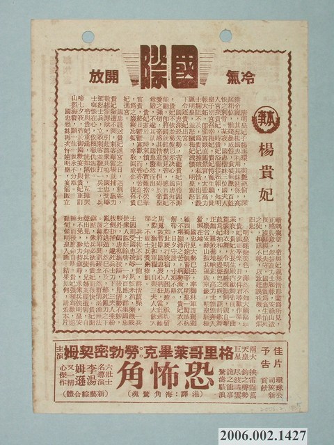 此物件是單張兩面,外觀保存良好,無破損情形。 主要內容為國際戲院《楊貴妃》本事,描述唐明皇與楊貴妃的故事,唐明皇最終因為迷戀楊貴妃,置國事不顧,以致安祿山造反也無力對抗終究難逃滅亡的命運。此面物件下方還有另一部電影預告片:《恐怖角》,由兩大天皇巨星格里哥萊畢克和勞勃密契姆主演,六壯士名導演李湯姆遜又一精心傑作。 另一面是東寶公司發行之《大劍客》電影的宣傳單,下期放映名稱為:《大劍客》(樁三十郎),是「東寶公司繼大鏢客後又一鬥劍娛樂巨片」。根據物件上所描述:《大劍客》(樁三十郎)是一部獨立的作品,劇情的發展剛勁中有幽默,打鬥中具風趣,決不是《大鏢客》(用心棒)的續集。「《大劍客》製作費超過《大鏢客》一億日圓以上,賣座紀錄超過大兩倍。鋼鐵般的陣容,百分之百娛樂,堂堂空前鉅片」。在下方還有另一預告片《大戰爭》是喜劇戰爭,是威尼斯電影獎獲獎鉅片。 所謂「本事」為簡單印刷的電影故事介紹,由影院提供購票觀眾留作紀念。