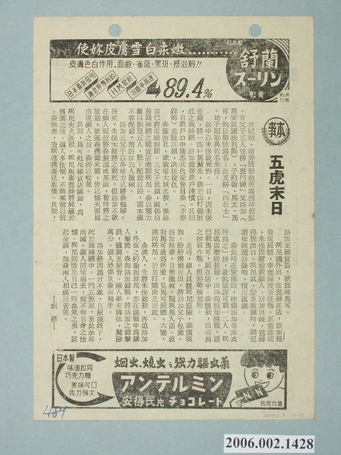 此物件是單張兩面,外觀保存良好,無破損情形。 主要內容為《五虎末日》本事,在20世紀初南非情形與美國西部相似,有父子五人號稱「喪門神」父路加,其餘四子以聖徒為名,但最後還是一門五煞星,最後全部消滅的下場。此面的下方有「蛔蟲、蟯蟲之強力驅蟲藥」的廣告。 另一面是派拉蒙公司發行之《雙虎屠龍》電影的宣傳單,下期放映名稱為:亞洲大戲院《雙虎屠龍》,「本片是西部片大導約翰.福特晚期的經典,也是他最後一部黑白片,闡述了人類社會從力強者勝發展到文明法治的歷史過程」。片中惡棍利柏提在酒吧中賭牌時,手上拿的牌型是黑桃A、梅花A、黑桃8、梅花8和已不可考的第五張牌,這是美國西部歷史上著名的典故,被稱為"死亡之牌" (dead man's hand),典故源自美國西部傳奇人物──蠻牛比爾(Wild Bill Hickok),他在1876年8月2日被仇家暗殺身亡時,手上拿的正是這樣的牌型。《雙虎屠龍》是美國國家電影保護局所選的典藏作品, 被認為是約翰.福特眾多西部片中,最重要的經典作品之一,而且是出色的心理戲。「保證從未看過如此緊張的電影!」 所謂「本事」為簡單印刷的電影故事介紹,由影院提供購票觀眾留作紀念。