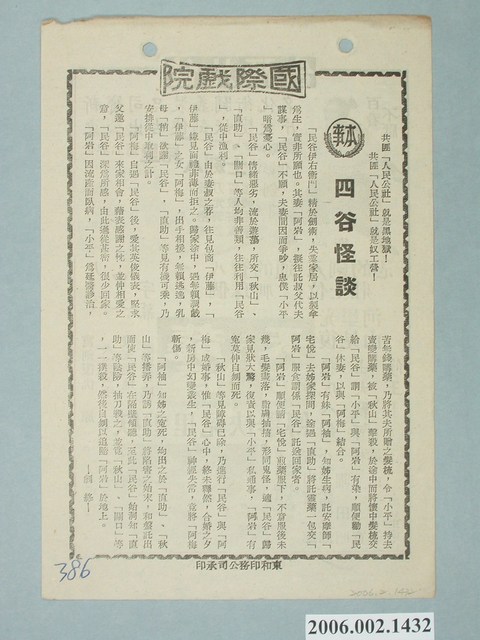 此物件是單張兩面,外觀保存良好,無破損情形,但因物件老舊,印刷有模糊的情形,由東和印務公司承印。 主要內容為國際戲院《四谷怪談》本事,故事是描述浪人伊右衛門生活變得潦倒,其妻子阿岩更被迫賣身。伊右衛門為了錢,決意要與另一富家女結婚,將強烈反對的阿岩毒死,埋於木門中。阿岩化成了厲鬼,對伊右衛門死纏不休的故事。《四谷怪談》這部取自民間的傳說的作品在日本有著180多年的歷史,悲奉為經典的怪談,在第一次被搬上舞台後的第四年文政12年,作者鶴屋南北去世,他死後的第二年其子女以及參與此劇的11人在5年間相繼死亡。而以後只要翻拍此劇,就總是有古怪的事發生,拍前參拜阿岩的稻荷神社成了不成文的規定。 另一面是新東寶公司發行之《龍虎八天狗》電影的宣傳單,物件名稱為:《龍虎八天狗》,新東寶公司出品,「古裝俠義劍鬪妖術變化大名片」,八個寶珠的神通,八位劍士的壯志,由若山富三郎、小笠原龍三郎等主演。 所謂「本事」為簡單印刷的電影故事介紹,由影院提供購票觀眾留作紀念。