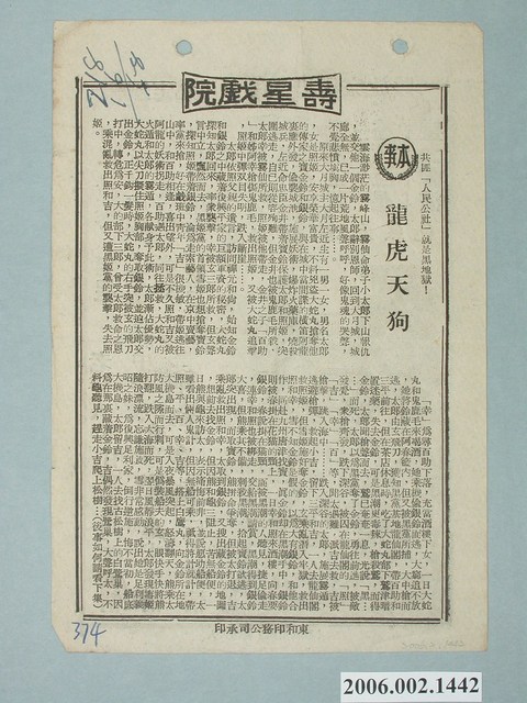 此物件是單張兩面,外觀保存良好,無破損情形,但物件紙張老舊,印刷有模糊、字體不清楚的情形,由東和印務公司承印。 主要內容為壽星戲院《龍虎天狗》本事,是描述太郎與照姬的神話故事,而且故事並未結束,還有下集(後事如何請看下集)。 另一面是松竹公司發行之《三代愛情》電影的宣傳單,此物件名稱為:《三代愛情》,是「日本松竹公司出品,三千部紀念作」。物件上寫著:「老年人不甘寂寞回味愛情,中年人食髓知味追求愛情,青年人無法無天玩弄愛情」由此可判斷影片是在描述老中青三代的愛情故事。 所謂「本事」為簡單印刷的電影故事介紹,由影院提供購票觀眾留作紀念。