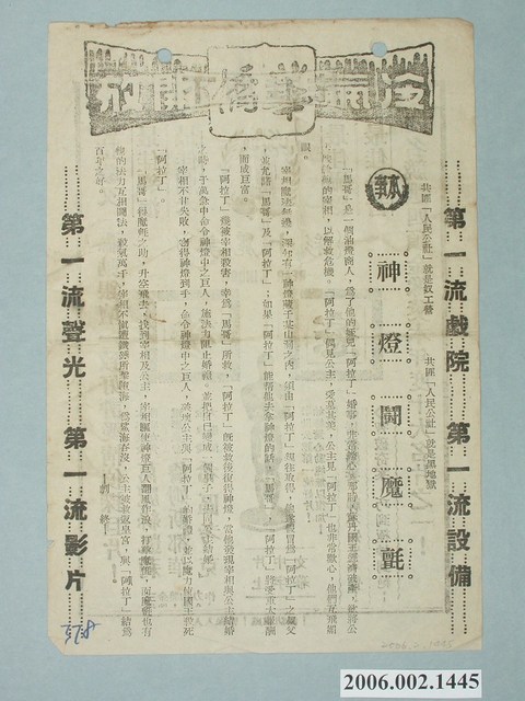 此物件是單張兩面,外觀保存良好,無破損情形,字體清晰,圖片清楚。 主要內容為華僑戲院《神燈鬪魔氈》本事。是在講述神燈與阿拉丁與公主之間發生的故事,最後阿拉丁和公主結為百年之好的故事。 另一面是派拉蒙公司發行之《後窓》電影的宣傳單,是「派拉蒙公司又一轟動銀壇一致好評愛情偵探名片,並提名競選四項金像獎」。故事是講述主角詹姆斯.史都華飾演攝影記者L.B. Jefferies,女演員葛莉絲.凱莉則扮演他的上流社會名模女友Lisa Carol Fremont,故事中被懷疑的兇手Lars Thorwald 是由雷蒙.布爾(Raymond Burr)演出。電影出色地把主題神秘謀殺,婚姻議題和偷窺的反思與道德批判結合在一起。是屠殺嬌妻, 神不知鬼不覺,智破奇案,巧到極妙到絕。 所謂「本事」為簡單印刷的電影故事介紹,由影院提供購票觀眾留作紀念。