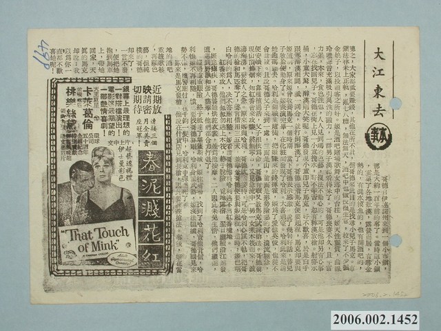此物件是單張兩面,外觀保存良好,無破損情形,但物件老舊泛黃。 主要內容為《大江東去》本事,故事是描寫歌德找兒子馬克,認識酒吧賭場歌舞女郎姬,以三人之間發生的故事為主軸,最後姬與歌德在一起的故事。 另有近期放映密切期待宣傳:《春妮濺花紅》,是環球公司五十周年紀念,由卡萊葛倫、桃樂絲黛主演。另一面是福斯影業公司(米高梅發行)發行之《決死雄師》電影的宣傳單,物件名稱為:國際《決死雄師》。「本片榮膺總統蔣公嘉獎為是繼《六壯士》後最佳歷史戰爭鉅片」;「米高梅發行福斯出品偉大歷史戰爭鉅片」。由李察伊根、黛安貝克主演,是真人真事改編,在希臘實地拍攝的《決死雄師》,講述西元前480年,波斯入侵希臘,在沒有援兵的情況下,斯巴達國王里奧尼達斯帶領著300名近身侍衛,在德爾摩比勒一役中,與波斯國王薛西斯的大軍周旋,以爭取時間集結援兵,雖然最後還是全軍覆沒,此役卻促成了後來希臘的統一,寫下歷史光輝的一頁。 所謂「本事」為簡單印刷的電影故事介紹,由影院提供購票觀眾留作紀念。