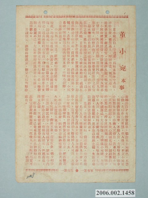 此物件是單張兩面,外觀保存良好,無破損情形,但物件老舊泛黃,字體顏色有變淡的情形。 主要內容為《董小宛》本事,董小宛名白,字青蓮,為明末秦淮中名妓,聰慧過人,琴棋書畫無所不通。下嫁反青志士冒辟疆,清順治喜愛董小宛,但是董小宛不願入宮。冒辟疆在逃難中數度患病,最後病死。董小宛之後也香消玉殞了。 另一面是香港發行之《孟麗君》電影的宣傳單,是在6月14日起上映。根據物件上資料此片是由鷺紅、高山、白雲、東方明珠等主演,是「一部歷史小說改編哀婉曲折香豔纏綿巨片」。另有影片《黃金恨》,預計在《孟麗君》上映結束後上映的影片,6月17日起上映。《黃金恨》是國產社會諷刺警示奇情巨片。 所謂「本事」為簡單印刷的電影故事介紹,由影院提供購票觀眾留作紀念。