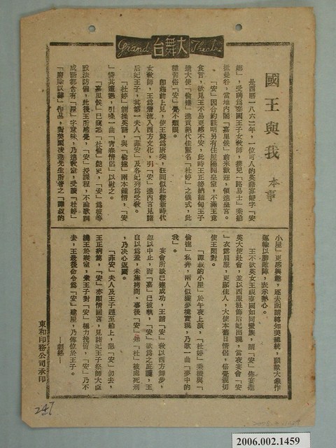 此物件是單張兩面,外觀保存良好,無破損情形,但物件老舊泛黃,字體顏色有變淡的情形,由東和印務公司承印。 主要內容為大舞台戲院《國王與我》本事,故事從英國女教師安應邀前往泰國擔任王子的家庭教師開始,發生在王與安之間的故事,王最後命令為安建屋,直到王子即位為止。 另一面是大同影業公司發行之《桃花過渡》電影的宣傳單,是「第一部臺語歌唱哀怨香艷空前巨片」,香港中國聯合影片公司出品,大同影業公司榮譽攝製發行。由小艷秋主演,鄭錦文監製。標榜本省觀眾應看本片,外省同胞也要一看的標語。 所謂「本事」為簡單印刷的電影故事介紹,由影院提供購票觀眾留作紀念。