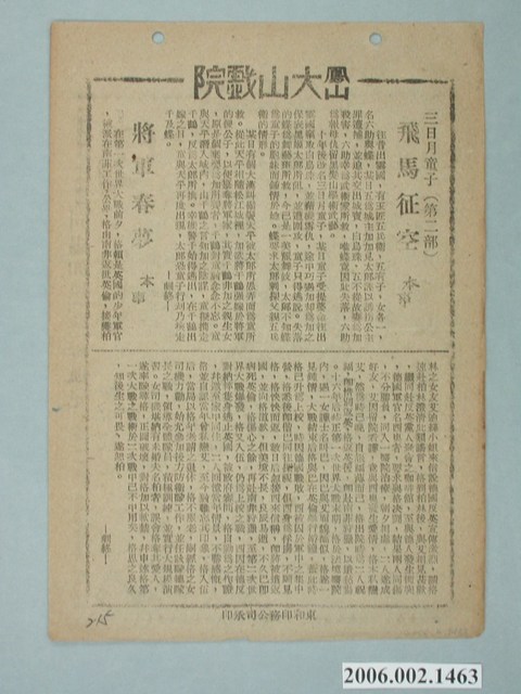 此物件是單張兩面,外觀保存良好,無破損情形,紙張老舊泛黃,由東和印務公司承印。 主要內容為鳳山大山戲院《三日月童子第二部飛馬征空》本事,是描述六助為報母仇留黑髮學術武藝。另有《將軍春夢》本事,是描述在第一次世紀大戰前夕,一位英國少年軍官的故事。 另一面是東映公司發行之《三日月童子》電影的宣傳單,是「日本東映公司最光榮出品,由東千代之介主演,輝煌鬪劍青春愛情鉅片」。氣魄雄威令人叫絕,打鬪緊張向所未見,劍光閃處賊膽寒,青春愛情大決鬪,鬪劍場面緊扣人心,戀愛鏡頭無比溫柔。 所謂「本事」為簡單印刷的電影故事介紹,由影院提供購票觀眾留作紀念。