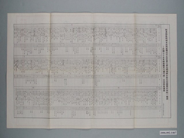 此物件為一選舉公報,為1986年的動員戡亂時期自由地區增額中央民意代表選舉的選舉公報,正面刊載「立法委員山胞選舉候選人」、「立法委員職業團體選舉候選人」的相關照片、資訊、政見,並署名臺灣省臺南市選舉委員會編印,背面則是此次選舉投開票所地點的一覽表。 此物件提到的是1986年的中央民意代表增補選,此次的選舉勢臺灣的第5次增補選,同時也是臺灣解嚴前的最後一次選舉,多位無黨籍人士在此次選舉中當選,如:康寧祥、吳淑珍、朱高正、許榮淑等。 對於增額中央民意代表選舉的出現,始於種種因素。中華民國憲法於1946年制定、1947年公佈且實施,但國民黨政府在1947年制定「動員戡亂時期臨時條款」,凍結憲法部分條文,且中華民國政府在這段期間喪失了大陸地區的統治權,上述因素下,依據「大法官釋字第76號解釋文」,因而第一屆中央民意代表的任期得以無限延伸。1969年,政府開始推動首次的中央民意代表增補選,而後在1972年再次舉辦增補選,並開放局部改選以及定期改選。此後,在1975、1983、1986、1989年都設有增額立委選舉。由於選舉的名額在全體立委總額的比例有限,議會政治中相互制衡的效益較不顯著。然而選舉發揮了提升民眾政治意識的作用,也為「黨外」運動提供發揮的場域。