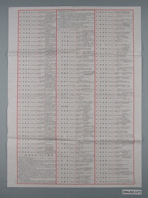 此物件為選舉公報內頁,該此次選舉為2005年5月14日舉行的中華民國國民大會代表選舉。 此次選舉共選出300位的國民大會代表,其任務是對2004年8月立法院所提出的修憲案進行複決,議案內容包含廢除國民大會的修正條文。由於此次選舉出來的國民大會代表,目的僅是對修憲案提出複決,又被稱為「任務型國大代表」。 此為因應第7次修憲之需求所舉辦的衍生選舉,該次修憲之目的在於調整立法委員的席次、任期、選舉制度,並將總統副總統的彈劾案改由司法院大法官審理,另外亦將廢除國民大會。此次選舉的精神,是希望模仿美國選舉人團制度,讓各黨團選擇修憲立場,讓民眾投票選擇貼近自己修憲立場的黨團,後選出黨團代表並依黨團立場投票表示贊成或反對,然而投票率僅有23.36%進而導致種種爭議。最終由贊成修憲的政黨取得大多數國大代表席次,此次修憲也成功通過。