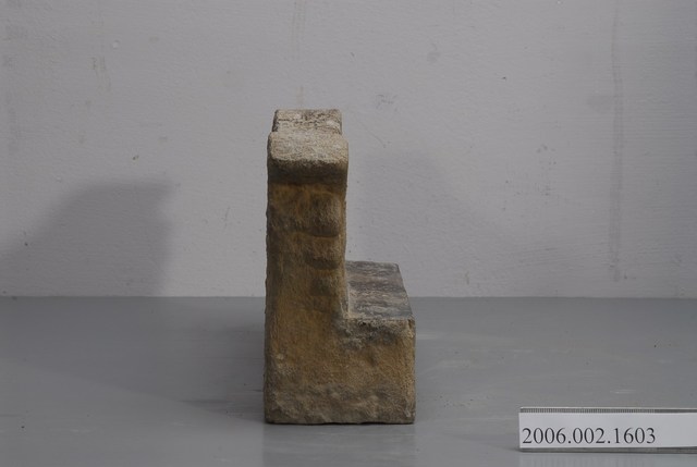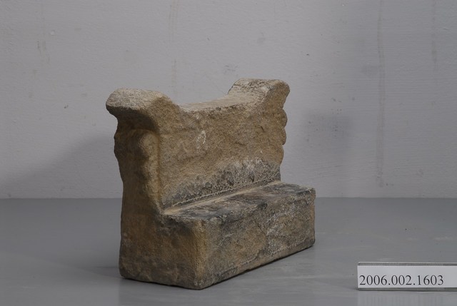 盒又稱敬盒、薦臺、奉案或「順盒仔」,為盛放供品的用具承臺,一般用來放置酒杯和水杯,以供奉神明。薦盒多以木器、漆器,陶瓷或錫等材質製成,其中以木製品為主,且多有精緻的雕刻。本件為石製雙層翹頭式薦盒,上下座前葉裝飾紋皆已脫落難以辨認。