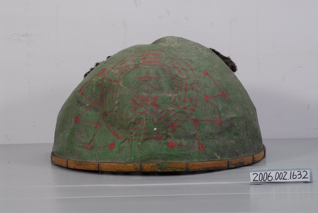 迎神賽會中,獅陣是重要的娛神活動,又因獅陣具有娛樂、掩護習武、驅祟逐鬼等意義,所以其發展源遠流長。臺灣的舞獅俗稱弄獅,以新竹分南、北兩獅,即南部獅和北部獅。目前流行於臺灣民間常見的舞獅種類有四:開口獅(臺灣北部獅屬之,又客家之盒仔獅亦屬開口獅),閉口獅(臺灣南部獅屬之),醒獅(廣東獅)和北方獅(北京獅)。本件獅頭嘴巴固定不能動,屬於南部的閉口獅。獅面有所凹損。獅額有太極八卦圖形。獅頭後面原應有二支桿架供舞獅時握持之用,已佚失。