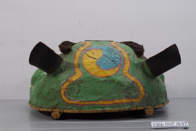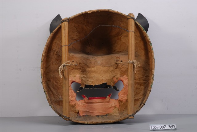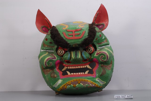 迎神賽會中,獅陣是重要的娛神活動,又因獅陣具有娛樂、掩護習武、驅祟逐鬼等意義,所以其發展源遠流長。臺灣的舞獅俗稱弄獅,以新竹分南、北兩獅,即南部獅和北部獅。目前流行於臺灣民間常見的舞獅種類有四:開口獅(臺灣北部獅屬之,又客家之盒仔獅亦屬開口獅),閉口獅(臺灣南部獅屬之),醒獅(廣東獅)和北方獅(北京獅)。本件屬閉口獅,獅頭下方有七星,額頂有太極,短耳,黃文博指出彰化一帶,有造型似貓的貓仔獅,表演的動作近似醒獅,似此。此件獅頭後有兩握桿,舞獅時可持用。
