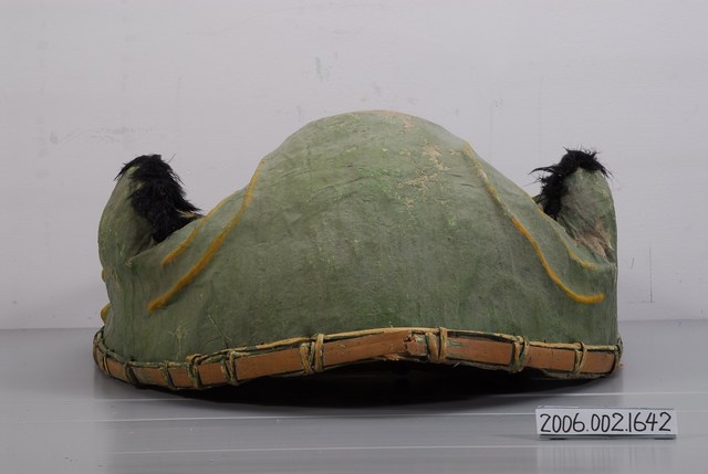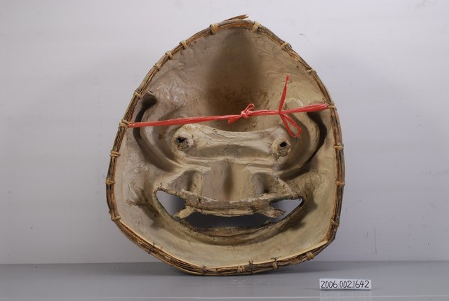 迎神賽會中,獅陣是重要的娛神活動,又因獅陣具有娛樂、掩護習武、驅祟逐鬼等意義,所以其發展源遠流長。臺灣的舞獅俗稱弄獅,以新竹分南、北兩獅,即南部獅和北部獅。目前流行於臺灣民間常見的舞獅種類有四:開口獅(臺灣北部獅屬之,又客家之盒仔獅亦屬開口獅),閉口獅(臺灣南部獅屬之),醒獅(廣東獅)和北方獅(北京獅)。本件屬閉口獅,額前有太極,獅嘴下有七星。獅頭後僅綁一紅繩,無握桿。