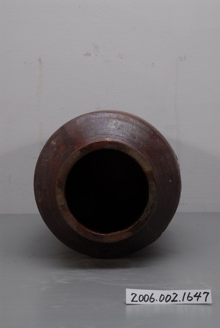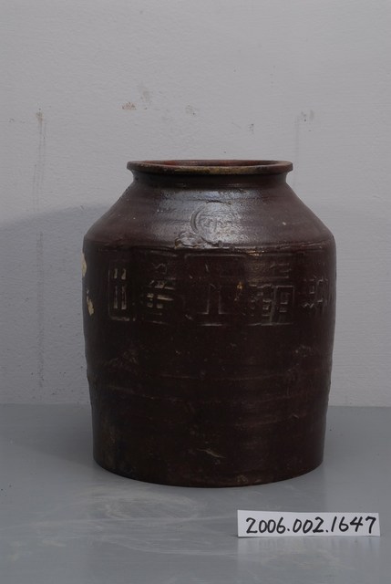 1.鮮霸王醬油甕,廣口,方唇,頸內縮,折肩,直壁,平底。外器壁肩部壓印圓形商標,腹部上半陽刻「鮮霸王醬油」五字,下半壓印四道寬的環形橫紋。施深褐色釉,釉厚薄不均,「油」字左方有二塊似白色油漆之不規則色塊。2.此類陶器亦可稱為「陶罐」,陶罐的器形與陶甕相似,形制較小,用途不定,通常用來盛裝油、鹽、糖等用量較少的日用品,常依其用途來命名。