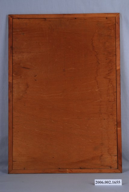 本件為觀音神明彩,構架為善財童子朝拜觀音像,善財的上方有隻啣著念珠的白鸚鵡。橫批「慈航普渡」,上聯「紫竹林中觀自在」,下聯「白蓮臺上現如來」,整體裱框。觀音媽聯為臺灣漢人傳統民宅正廳常見的神明圖像,成為家宅守護神。最早於日治時期之前即出現。