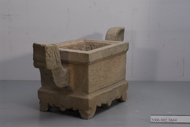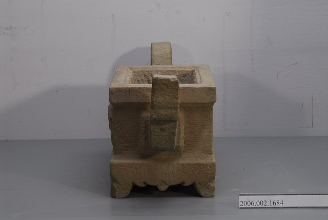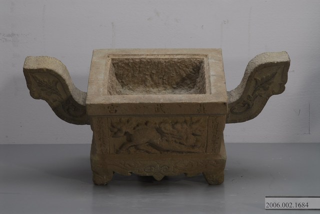 本件為民國39年真武宮石香爐,器身方形,口沿中央陰刻「真武宮」,左側刻「民國卅九年三月」,右側刻「弟子饒信琦謝」。爐身正面中央為麒麟回首紋,展耳裝飾樹葉紋。香爐是祭祀神祇或祖先的宗教供具。材質有石、陶瓷、金屬等,多置於神桌上,爐身以圓形、方形居多。