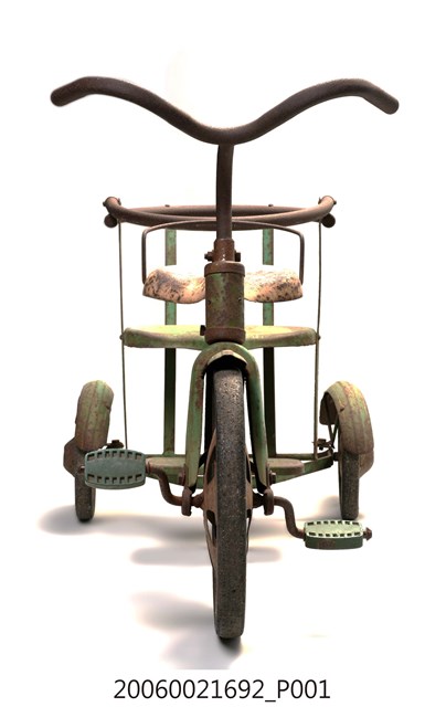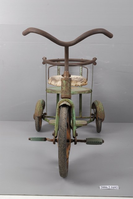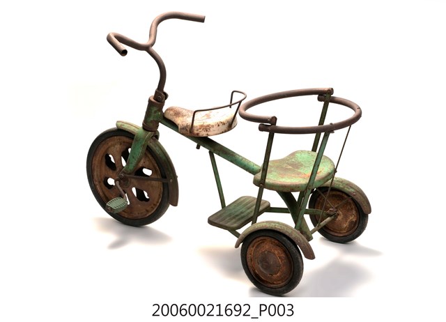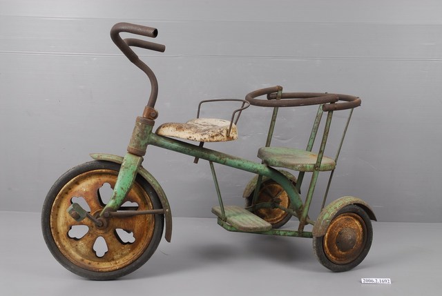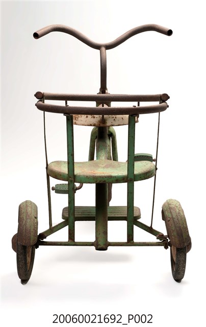 本文物為兒童三輪車,鐵管結構,以綠色為底,有後座與腳踏板設計,具運動性,可讓還不具平衡能力的兒童使用。表面已有多處的生鏽與污漬。養育孩童為傳統婦女在家之重要工作,家庭中的女性需要擔起家庭事務與照顧孩子的責任,兒童三輪車作為輔助他們的成長玩具。