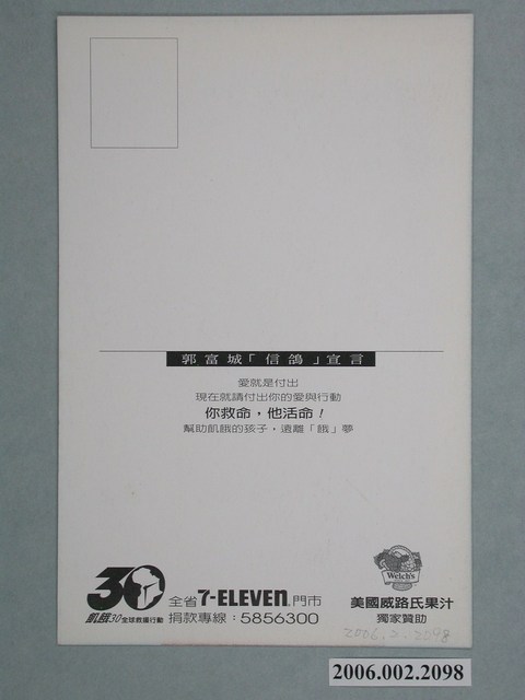 1.香港歌手、電影明星郭富城在臺發行中文照片明信片,直式雙面,此明信片與公益活動飢餓三十合作,背景為藍,他頭髮濕濕的,眼神直視前方,身穿一件緊身紫色POLO衫,肩上停著一隻白色鴿子,另一隻則在被他雙手握住,憂鬱的神情直視前方,右下角則用白字註記「信鴿」,「Love,dove」重疊,註記他的英文名字「aaron kwok」,左邊則印有他白色親筆簽名字樣,左上角則是專輯發售的廠商Logo,正面狀況大抵良好,背面為明信片格式,中間一道橫線,橫線下方則註記「郭富城信鴿宣言」,下方邊緣則有一排活動單位資訊「飢餓30」,「美國威路氏果汁獨家贊助」。2.香港明星郭富城於1984年出道,也是1990年代香港樂壇「四大天王」之一,發行過多張膾炙人口的專輯如《對你愛不完》等,《信鴿》專輯1997年推出。也曾以電影作品《三岔口》、《父子》榮獲兩屆金馬獎最佳男主角。