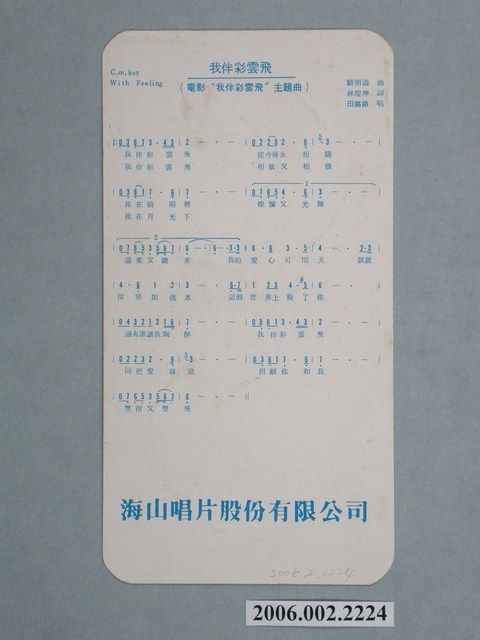 1.臺灣歌手田路路在臺發行中文彩色照片書卡,直式雙面,四分之三版面為田路路側臉,背景全黑,她面對右邊版面身穿白色高領上衣,黑色外套,眼神往下,一頭長捲髮,下方白色版面則註記「我伴彩雲飛,田路路海山專屬歌星」,上方版面黑色處有些白點,邊緣處有些膠痕,背面則是用藍色印刷數字簡譜,右邊註記「駱明道曲,林煌坤詞,田路路唱」,下方註記「海山唱片股份有限公司」,上方版面有些髒污,但狀況大抵良好。2.臺灣歌手田路路活躍於1980年代,此首歌曲為電影《我伴彩雲飛》同名歌曲,此部電影由邵式製片廠於1978年出品,陳鴻烈執導,爾冬陞、妞妞主演,主題曲由田路路所唱。