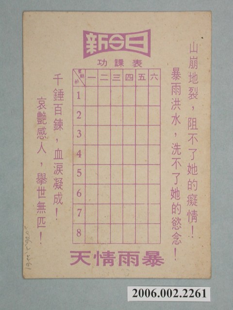 1.美國電影《暴雨情天》在臺上映中文彩色宣傳卡片,橫式雙面,使用手繪風格,背景為藍天卻隱約描繪嚴苛的山上雪景,男主角李察波頓位於左邊版面親吻女主角的右臉,這浪漫的場景卻被周圍殘忍又爆裂的戰爭場面圍繞,甚至有猛虎吃人的場景位於下方版面,右上方版面則註記文案「山崩地裂,阻不了她的癡情,暴雨洪水,洗不了她的慾念」,羅列主要演員名單,下方版面則是紅字片名由左至右閱讀「暴雨情天」,左下角則直書註記文案「千垂百鍊、血淚凝成,哀豔感人,舉世無匹」。右邊邊緣有些髒污,背面為直式為設計一功課表,左右邊也都有文案,與正面重複,整體泛黃。2.《暴雨情天》於1955年由美國 Twentieth Century Fox出品,Jean Negulesco執導、 Lana Turner, Richard Burton主演。