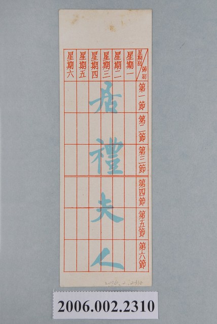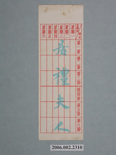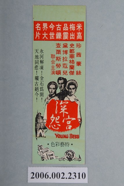 1.美國電影《深宮怨》在臺上映中文彩色電影宣傳書籤,直式雙面,底色為淺綠色,上方邊緣紅色版面註記「米高梅出品震古鑠今世界大名片」,下方主視覺為男女幾位主角以黑白色調設計,中間則有一紅色區塊註記中文片名《深宮怨》,左邊邊緣則有文案宣傳「冰河解凍!金石為開!天地同悲!曠古決今!」下方則有米高梅的Logo,也註記「特藝彩色」等放映規格,整體有點灰塵但大抵良好,背面則設計一長型功課表,再用水藍色墨水壓印「居禮夫人」,上方有些黃色鏽漬,狀況尚佳。2.美國電影《深宮怨》於1953年由 Metro-Goldwyn-Mayer (MGM) 出品,George Sidney、 Jean Simmons, Stewart Granger, Deborah Kerr 主演。