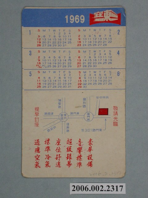 1.香港電影《船》在臺發行中文彩色宣傳書籤,直式雙面,圖片需橫式觀看,一群青春年輕男女在草地上快樂的奔跑,有井莉也有何莉莉,下方則保留一白色版面,右邊則註記播放地點「東寶大戲院,鐵定本月22日上映」,中間則是桃色片名《船》,左邊則羅列主演名單,下方則註記此作為「邵氏綜藝體,弧形闊銀幕,文藝愛情片,豔彩色鉅片」,白色有些泛黃,邊緣有些磨損,書籤背面為1969年東安大戲院製作1969年半年年曆,下方則是戲院地圖,文案標註戲院規格「豪華設備,音響標準,超級銀幕,座位舒適,標準冷氣,過濾空氣」,整體為淺藍色調,背景有些泛黃。2.香港電影《船》為1967年由邵氏影業出品,改編自瓊瑤同名小說,導演為陶秦,主演為何莉莉、金漢、井莉。