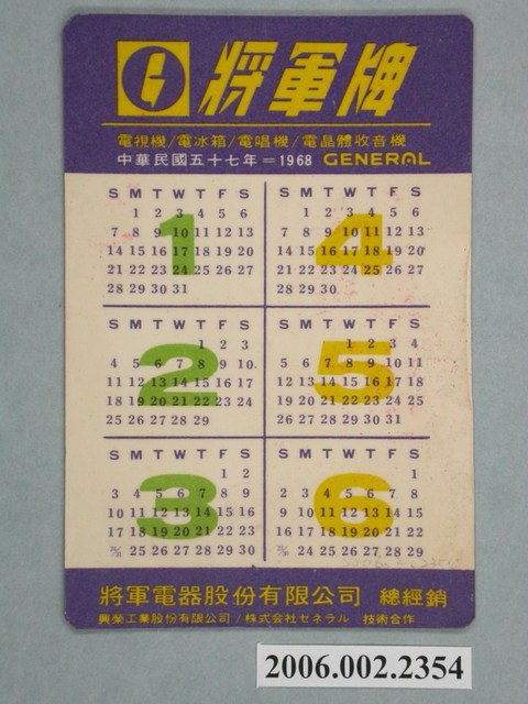 1.臺灣電器品牌將軍牌火辣女郎廣告宣傳年曆卡片,直式雙面,正面底色大紅色,右邊版面則站一位金髮女郎,她身穿比基尼,比基尼的款式使用金色葉片款式拼接而成,款式為三點式,下方註記「將軍牌」三個大字以及其Logo,顏色為黃色,邊緣有些磨損,背面上方版面則一樣註記牌子的名稱,也註記此張卡片發行時間「中華民國五十七年=1968年」,此為半年年曆,下方版面邊緣則特別標註此牌機械輕家電用品皆與日本技術合作,整體版面有些髒污,但大抵良好。2.此張臺灣電器品牌將軍牌廣告宣傳年曆卡片於1968年出品,將軍牌成立於民國64年的,全名為將軍電器股份有限公司,此家其實早在日治時期就存在了。臺灣光復之後,由臺灣興榮工業股份有限公司與日本ゼネラル株式會社技術合作,主要是生產電視機與電冰箱,當時臺灣正好跨越黑白至彩色電視時期。