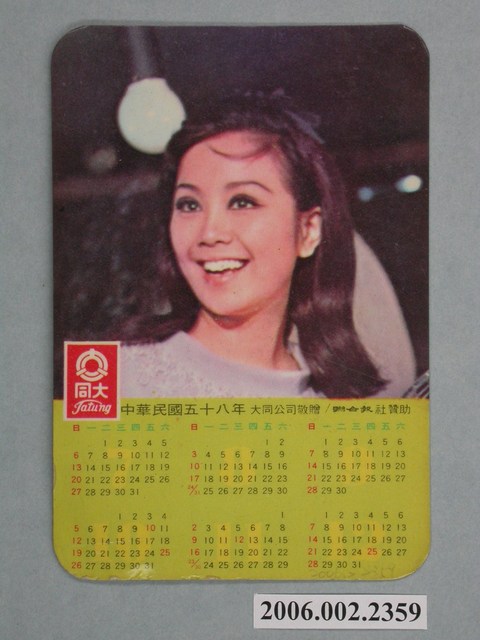 1.臺灣大同公司冉肖玲明星照片廣告年曆卡片,直式雙面,正面上方版面為一金色簾幕,左邊邊緣則推測照到一側的電風扇,冉肖玲身穿白色無袖上衣,側身向左方,她眼神則直視正面前方,她把頭髮紮起成為包頭展現俏麗氣質,朱唇露齒燦笑展現大方氣質,版面左邊邊緣偏下方則有「大同」紅色Logo,下方則是設計綠色版面為民國五十八年上半年年曆,此張卡片為大同公司敬贈/聯合報社贊助,下方邊緣有些推擠過的摺痕,但狀況大抵良好,背面版面配置與正面相同,但是上方版面背景較黑,右上角則有一顆白色燈泡,冉肖玲一頭長髮,瀏海夾起像是公主頭。身穿灰色毛衣,她眼神則直視左面前方,露齒張嘴燦笑展現青春活潑氣質,版面左邊邊緣偏下方則有「大同」紅色Logo,下方則是設計綠色版面為民國五十八年下半年年曆,下方邊緣有些推擠過的摺痕,背面狀況較差,整體版面有些灰白感,可能有些褪色,狀況尚可。2.臺灣大同公司冉肖玲明星照片廣告年曆卡片發行於五十八年,大同為臺灣經典老牌子以電子工業為主的公司,臺灣歌手冉肖玲活躍於1960-1970年代,以低音聞名,因此有「小白光」、「低音歌后」之別稱,經典歌曲有《夏日的貝殼》、《藍色的夢》。