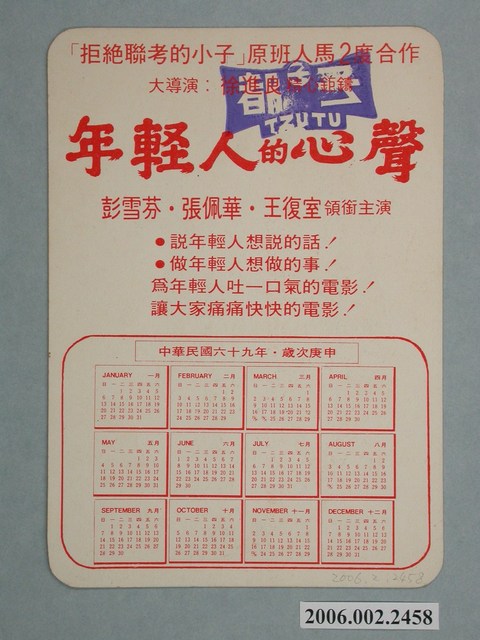 1.臺灣女星彭雪芬的明星照片小卡,直式印刷。畫面主要呈現彭雪芬微笑模樣的半身特寫,搭配「『年輕人的心聲』女主角彭雪芬」字樣。背面印有年曆及電影文案。2.造型出自臺灣電影《年輕人的心聲》,1980年由寶華影業公司出品,聯豐影片有限公司發行,徐進良執導,吳念真編劇,彭雪芬、張佩華、王復室主演的劇情片。