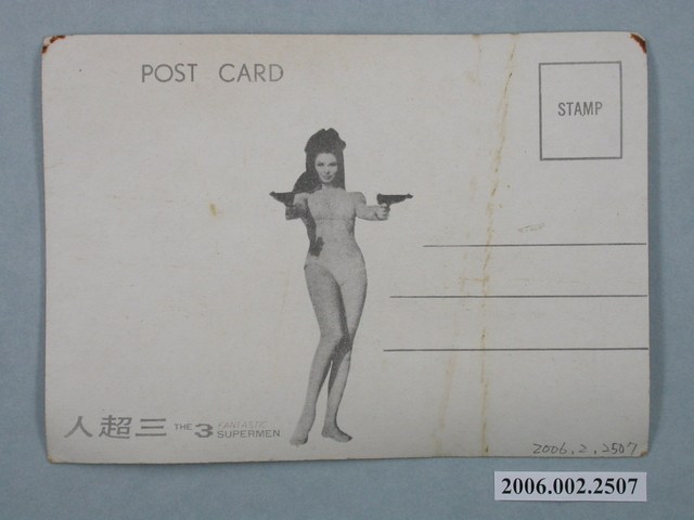 1.義大利、法國、西德、南斯拉夫合製片《三超人》上映時的中文彩色明信片,橫式印刷。畫面主要呈現兩張照片,大張為紅色緊身衣人爬牆而上,接近站在獨木上的女子;另一張為三名紅色緊身蒙面男子站在一起的近全身照。搭配「三超人」、「天下無敵 震撼全球 第一巨片」、「伊士曼彩色 大銀幕」、「THE 3 FANTASTIC SUPERMEN」等文案字樣。背面印有「POST CARD」、「STAMP」字樣。海報有二折折痕;上邊左處有破損。2.《三超人》(The Three Fantastic Supermen)是1967年義大利、法國、西德、南斯拉夫合製的超級英雄電影,由Cinesecolo、Parnass Film、CFFP、Avala Film出品,Gianfranco Parolini執導,Marcello Coscia、Gianfranco Parolini、Theo Maria Werner編劇, Tony Kendall、Brad HarrisAldo Canti主演的劇情片。