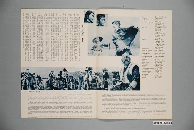 電影本事《十三條蟲》封面、封底皆直幅彩色印刷,外觀保存良好。電影由潘迎紫、江明主演,導演侯錚,臺灣電影。內頁為《十三條蟲》電影本事內容,黑色印刷。