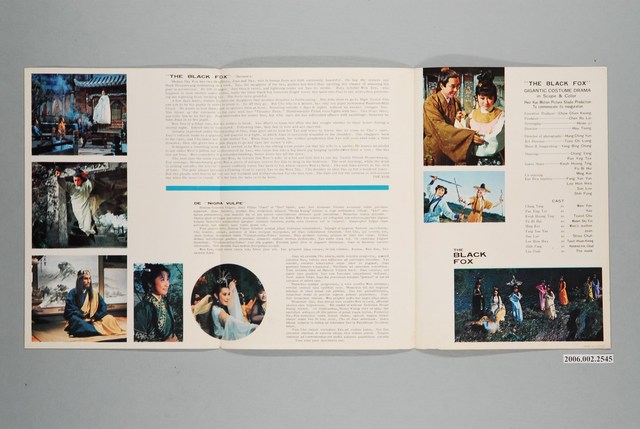 電影本事《狐妻》封面3折頁皆直幅彩色印刷,外觀保存良好。電影由潘迎紫、張揚主演,導演侯錚,臺灣電影。折頁包含《狐妻》本事內容,同時也為其他8部《戰國風雲》、《釵頭鳳》等即將上映電影宣傳。內頁3折頁為《狐妻》電影英文版介紹,彩色印刷。