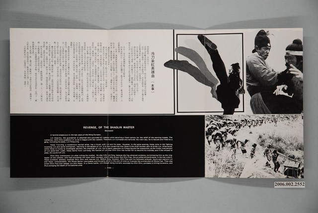 電影本事《冷刀染紅英雄血》封面3折頁皆直幅彩色印刷,外觀保存良好。電影由譚道良、陳星主演,導演羅臻,臺灣電影,晉和影業出品。折頁包含中英文演員表與劇照。內頁3折頁為《冷刀染紅英雄血》電影中、英文版本事與劇照,黑色印刷。