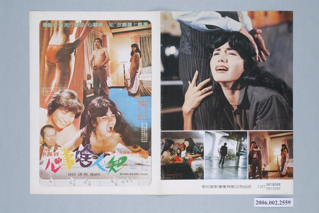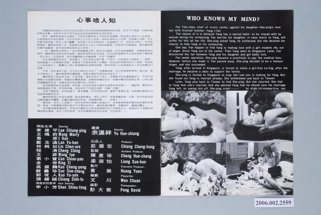 電影本事《心事啥人知》封面、封底皆為直幅彩色印刷,外觀保存良好。封面有「限」代表電影分級為限制級的字樣。電影由李建平、王瑪莉主演,導演 余漢祥。封底為劇照。內頁為《心事啥人知》電影中、英文版本事與演員名單。直幅黑色印刷。英文版本事上方標題為Who knows my mind?