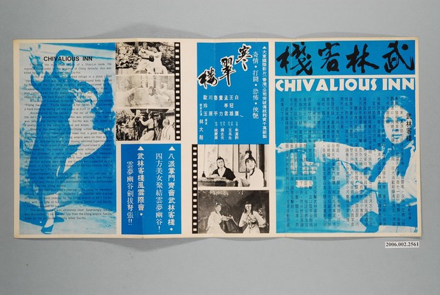 電影本事《武林客棧》封面3折頁皆直幅彩色印刷,外觀保存良好。電影由黃家達、嘉凌主演,導演林大超,導演名字中英文皆有。內頁3折頁為《武林客棧》電影中、英文版本事與劇照,彩色印刷。也為《寒翠樓》電影宣傳。