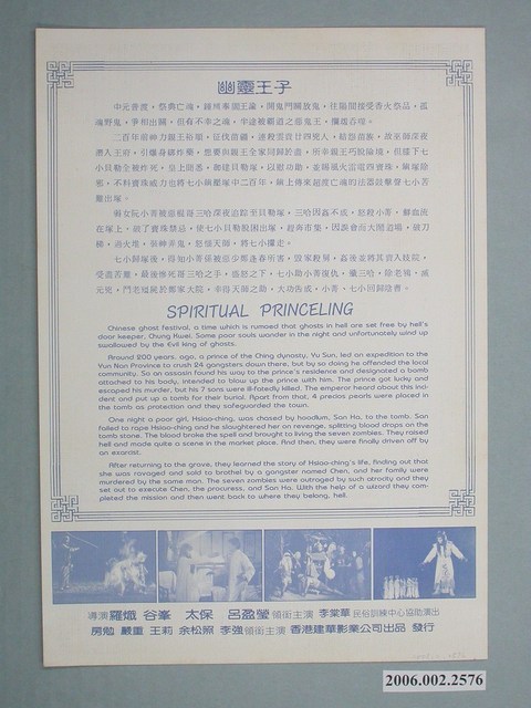 電影本事《幽靈王子》直幅彩色印刷,外觀保存良好。電影由 谷峰、太保主演,導演羅織。背面為《幽靈王子》電影中、英文版本事。直幅藍色印刷。