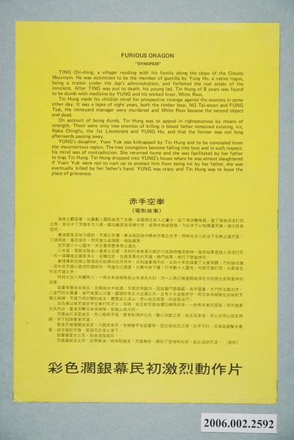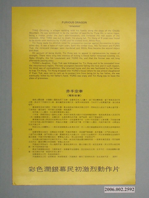 電影本事《赤手空拳》直幅彩色印刷,外觀保存良好。電影由李元慶、田野主演,導演姚鳳磐。華國電影製作。背面為《赤手空拳》電影中英文版本事,直幅黑色印刷。