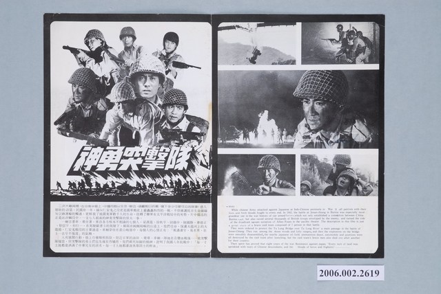 電影本事《神勇突擊隊》封面封底皆直幅彩色印刷,外觀保存良好。電影由梁修身、向雲鵬主演,導演午馬,浩瀚有限公司出品。含中英文製作群演員名單。內頁為《神勇突擊隊》電影中英文版本事,黑色印刷。