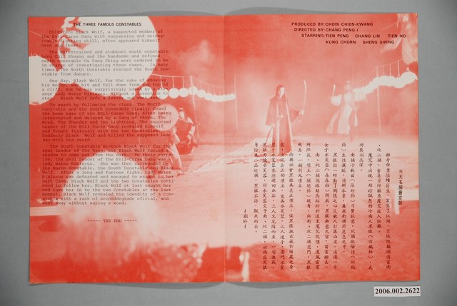 電影本事《三大名捕會京師》封面封底皆直幅紅黑雙色印刷,外觀保存良好。電影由田鵬 、張玲主演,導演張鵬翼 ,華國電影出品。內頁為《三大名捕會京師》電影中英文版本事,紅黑雙色印刷。