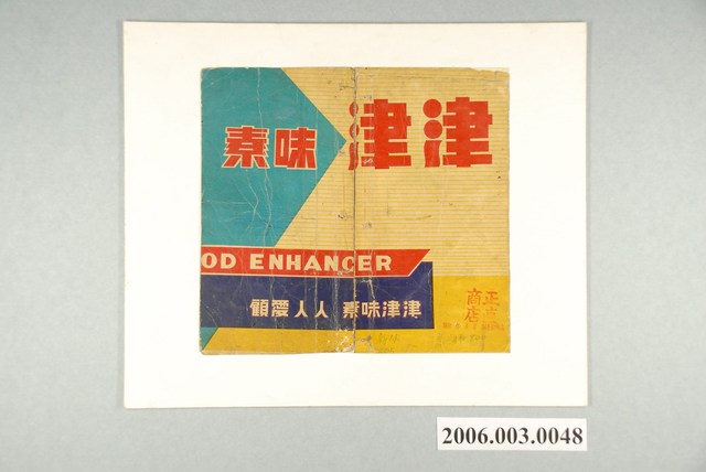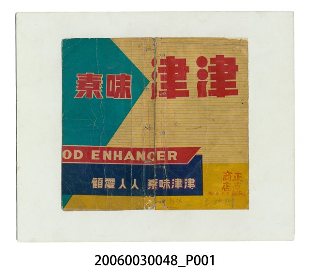 本件津津味素單面廣告紙為紙質作單面彩色印刷,呈長20.6公分,寬19公分之正方形。廣告紙另襯有裱紙,並以木條框裝裱而成。版面背面以原子筆書寫雜記,正面以幾何色塊作版面設計,上半部為黃色橫向條紋,左側以藍綠色三角色塊裝飾,下端呈橫向長方形黃底框。廣告單上端印有紅色「津津味素」字樣,下端以紅色條框內印白色「OD ENHANCER」,下接藍色長方形底框,內部同樣以白色印有「津津味素,人人愛顧」字樣。版面右下方帶有紅色印章「正直商店,昭和_年_月_日期差引殘高」。