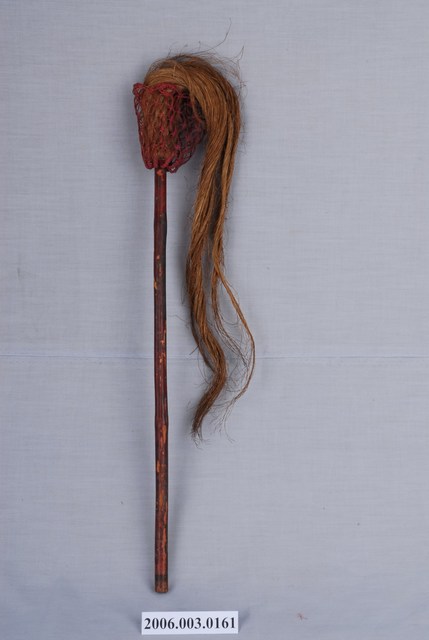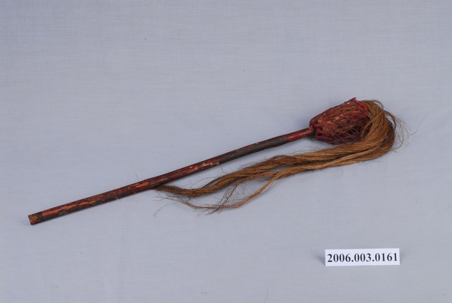 本件拂塵握柄為木製,在頂端裝馬尾。握柄施有朱漆,表面有脫漆和污漬現象,拂毛部位以黃色馬尾束成,並有局部顏色變深現象。拂塵在握柄與拂毛交接處套裝紅色網袋,以作為保護。
