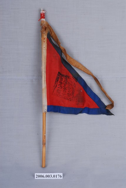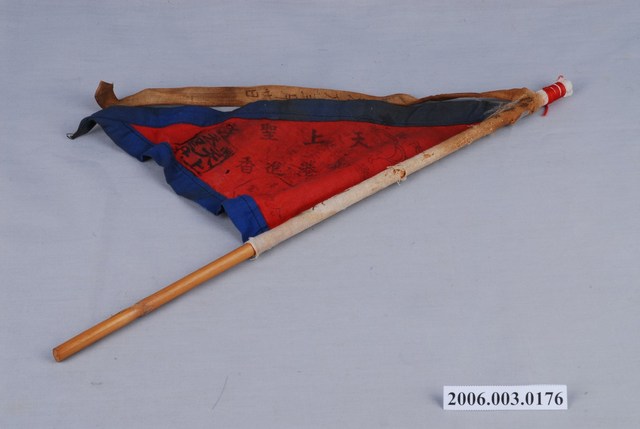 1.本物件為天上聖母北港進香旗,由木棍撐起,旗面為紅底藍邊,上寫有「天上聖母」「北港進香」等字,旗面上蓋有「南天宮天上聖母」「笨港水仙宮」「霧峰南天宮」等印,無法斷定為何宮廟所帶出。一般進香旗於進香活動結束後,會將進香旗供奉於家中,不會隨意丟棄。2.進香原指信徒至名山寺廟朝拜,臺灣因早期移民而移植原籍神明,出現不少分靈或分香的廟宇,因而出現回到祖廟進香以維持其靈威與虔誠性的活動。臺灣著名的進香聖地以王爺廟與媽祖廟為盛,如臺南市南鯤鯓代天府以及大甲媽祖與白沙屯媽祖。進香是為了掬取香火,使本廟的香火興旺,故有更新、增強香火的意義,活動本身亦是社會變遷、常民文化的展現。