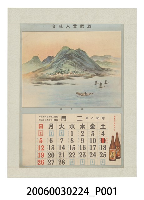 1.本物件為酒販賣人組合發行月曆之昭和8年2月,為紙質,呈長方形,為昭和8年2月份月曆,正上方有「酒販賣人組合」黑色字樣,下方為彩色之淡水港圖繪,正面下半部分有昭和8年2月份之各日期對照星期制表格,其中日曜日(星期日)之數字皆以紅字表示為假日,另節慶之日則以紅色圓圈圈起數字表示,正面右下則有「微醺陶醉價千金」紅色字樣,更下方則有2瓶酒瓶,貼有標籤「金鷄」、「蕾鷄」黑色字樣。
