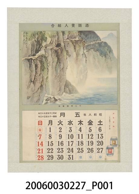 1.本物件為酒販賣人組合發行月曆之昭和8年5月,為紙質,呈長方形,為昭和8年5月份月曆,正上方有「酒販賣人組合」黑色字樣,下方為彩色之外太魯閣斷崖圖繪,正面下半部分有昭和8年5月份之各日期對照星期制表格,其中日曜日(星期日)之數字皆以紅字表示為假日,正面右下則有「一日の勞苦も一杯の酒」黑色字樣與「酒鄉樂境」紅色字樣,更下方則有2壺酒,上有標籤及字樣惟字樣模糊辨識不清。