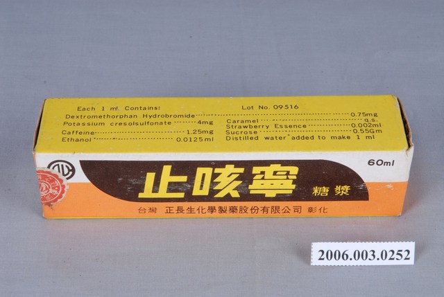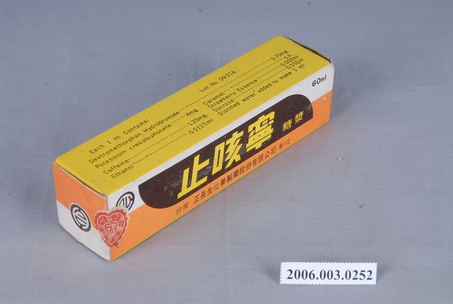 1. 本物件為止咳寧糖漿。包裝紙盒為長條型,印有中英文藥品名和衛署藥製字第15043號字樣,以及成分、用法用量和主治效能等,主治效能為鎮咳祛痰。
